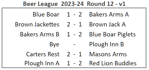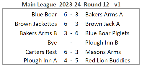 Back to the league matches this week and Carter’s Rest, Brown Jackettes and Blue Boar Piglets have all started the year very well, winning their Main League matches 6-3 and their Beer legs 2-1.