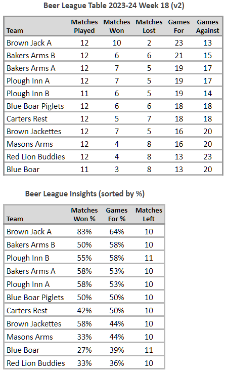 In the Beer League, Brown Jack A have retained their top spot and gained one more point over second position Bakers Arms B.