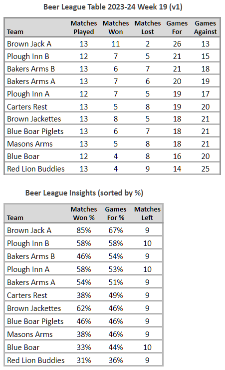 In the Beer League, Brown Jack A have started to pull away from the other teams thanks to a 3-0 win against the Blue Boar Piglets.