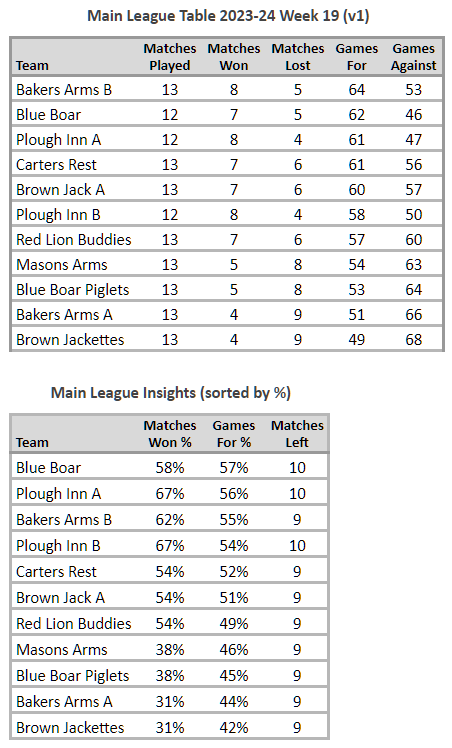 Plough Inn A’s top spot was short lived due to their bye this week, and so Baker’s Arms B have replaced them in first position.