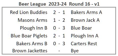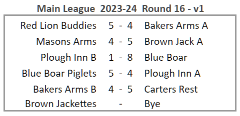 No activity in the knockout cups this week, but a superb League result for the Blue Boar, winning 8-1 and 3-0 against Plough Inn B. This is the best performance of the season so far, beating the previous best of Bakers Arms B against Red Lion Buddies which was 8-1 and 2-1 in Round 11.