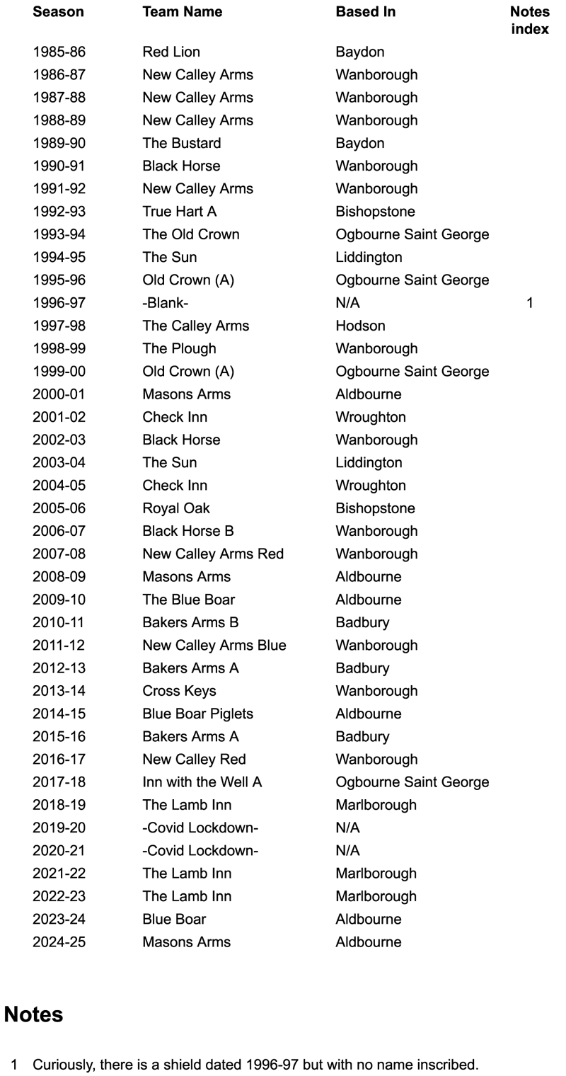 Listed below are the Main League winners from 1985-86 to date.